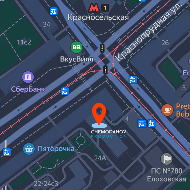 Адрес: г. Москва, ул. Краснопрудная, д. 24 стр 1. Телефон:+7 (495) 109-50-35, Электронная почта: info@chemodanov-production.ru График работы: ежедневно с 10.00. до 23.00, без перерыва на обед